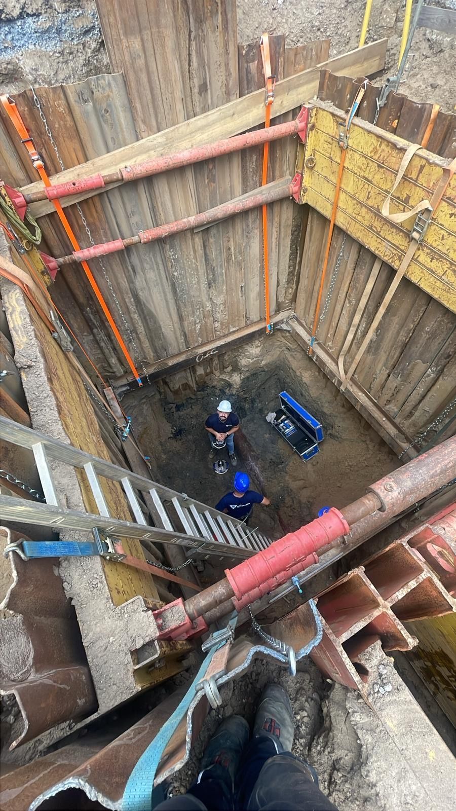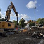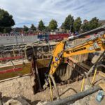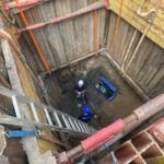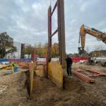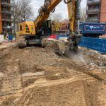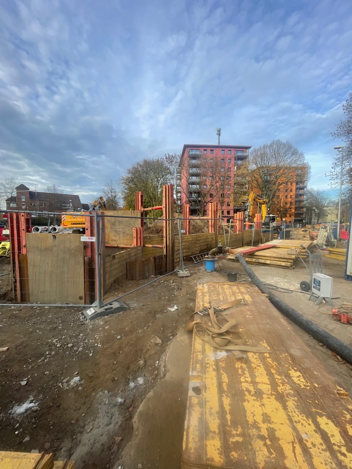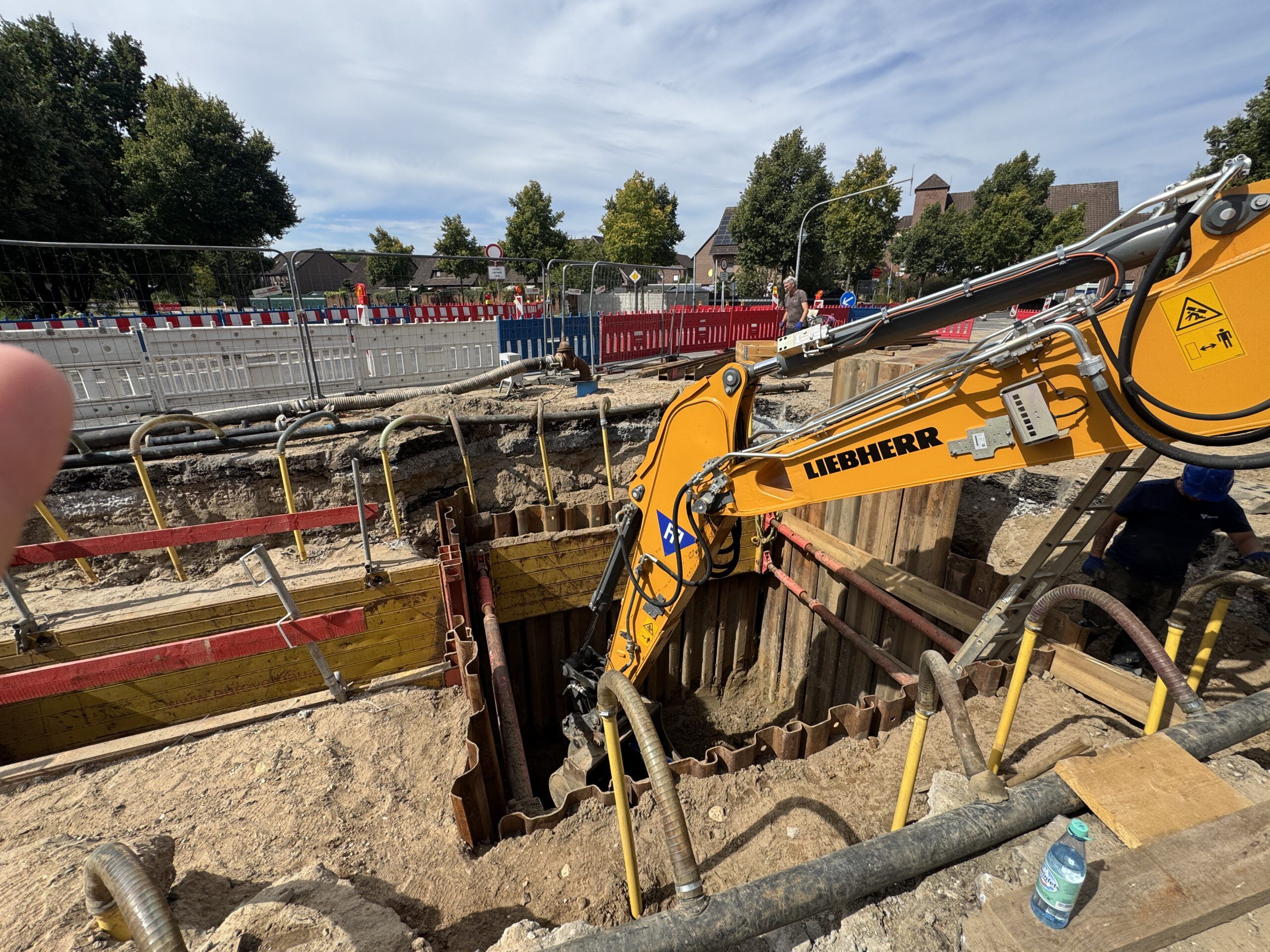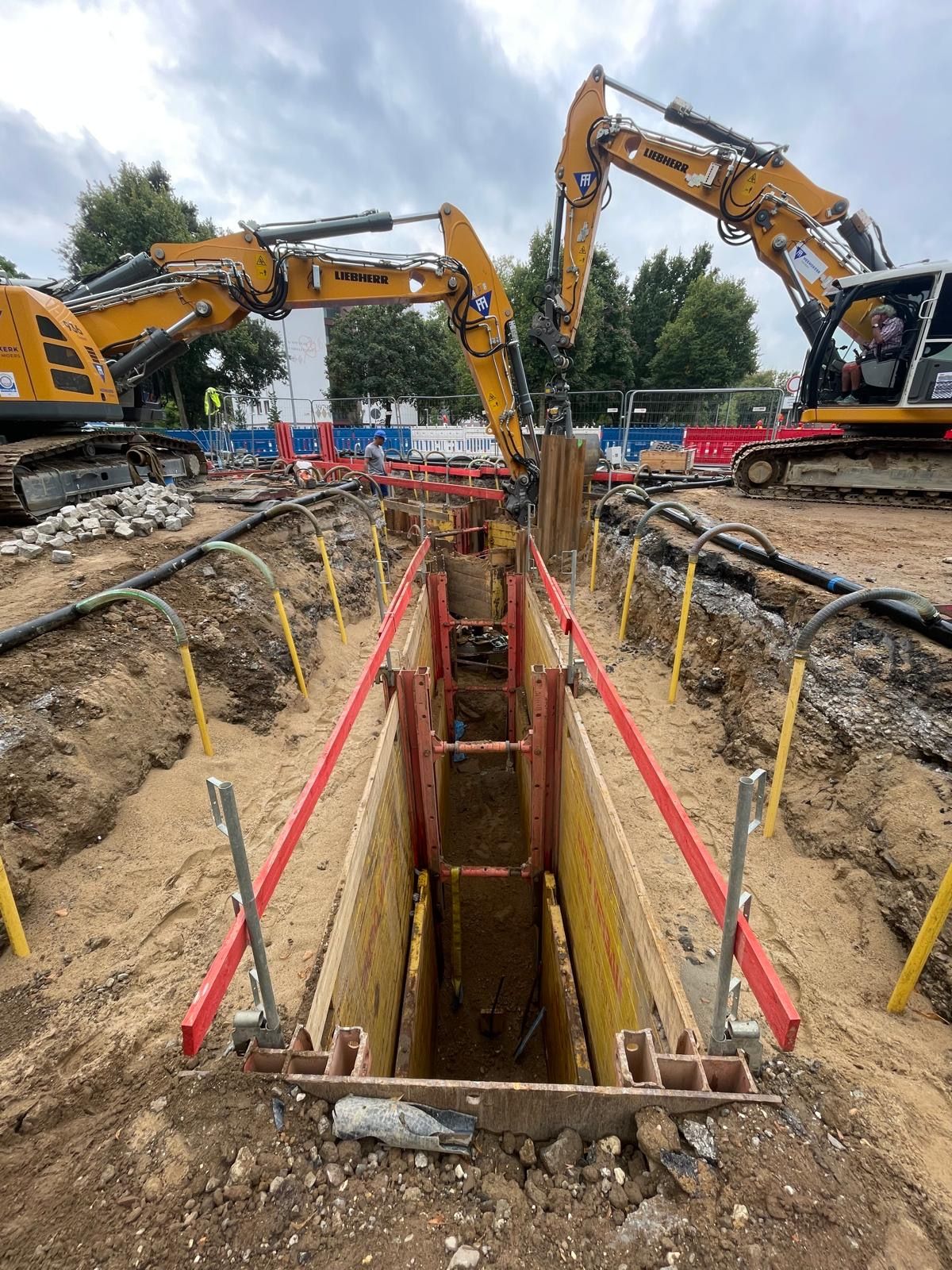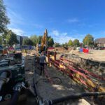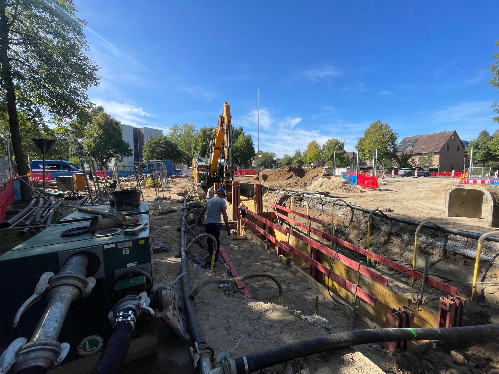 Besonders aufwendig war die Grundwasserabsenkung mittels Tiefbrunnen und Filterlanzen, die für die Herstellung der Schmutzwasserkanäle DN 250 in ca. 6,50 m Tiefe sowie der Regenwasserkanäle DN 400 in ca. 4,00 m Tiefe erforderlich war.
